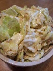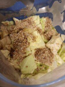 2,1に有機塩キャベツのもとを大さじ1、ごま油大さじ1を入れてよく混ぜ合わせると出来上がり
