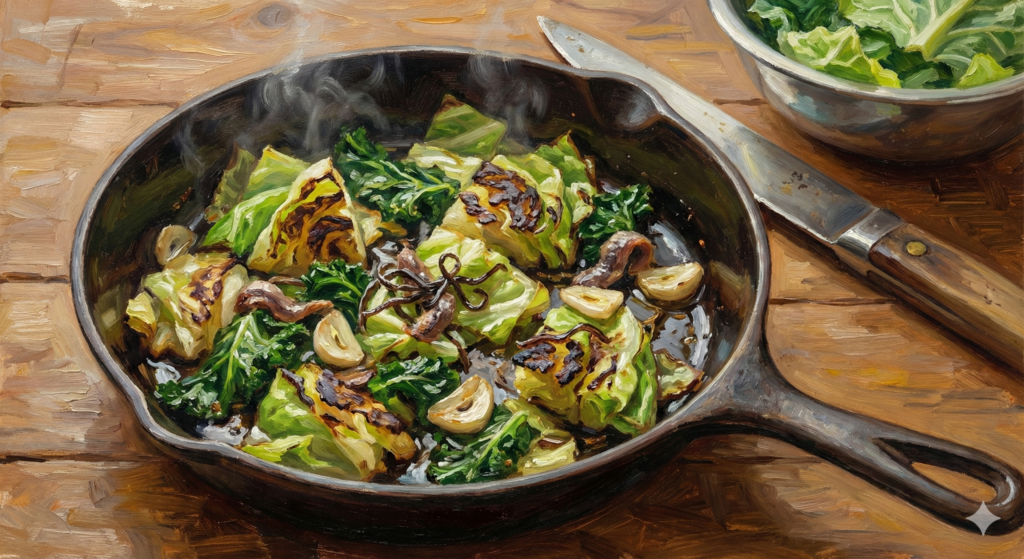 1/4にカット(ここだけ包丁使用)、あるいは葉っぱを手でバリバリちぎってフライパンへ。 ニンニクとアンチョビ、あるいは塩昆布と一緒に強火で「焼き目」がつくまで焼くだけ。